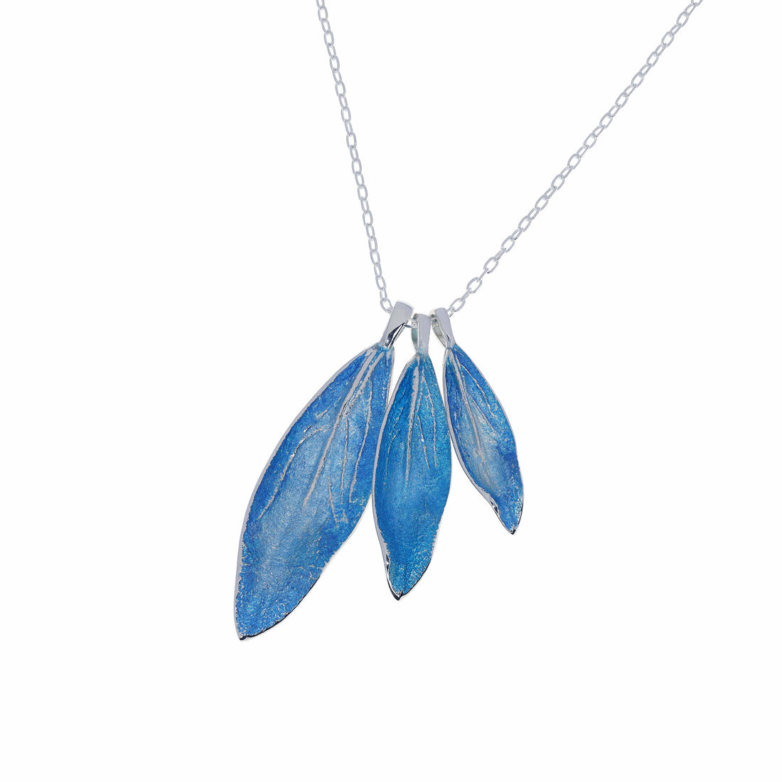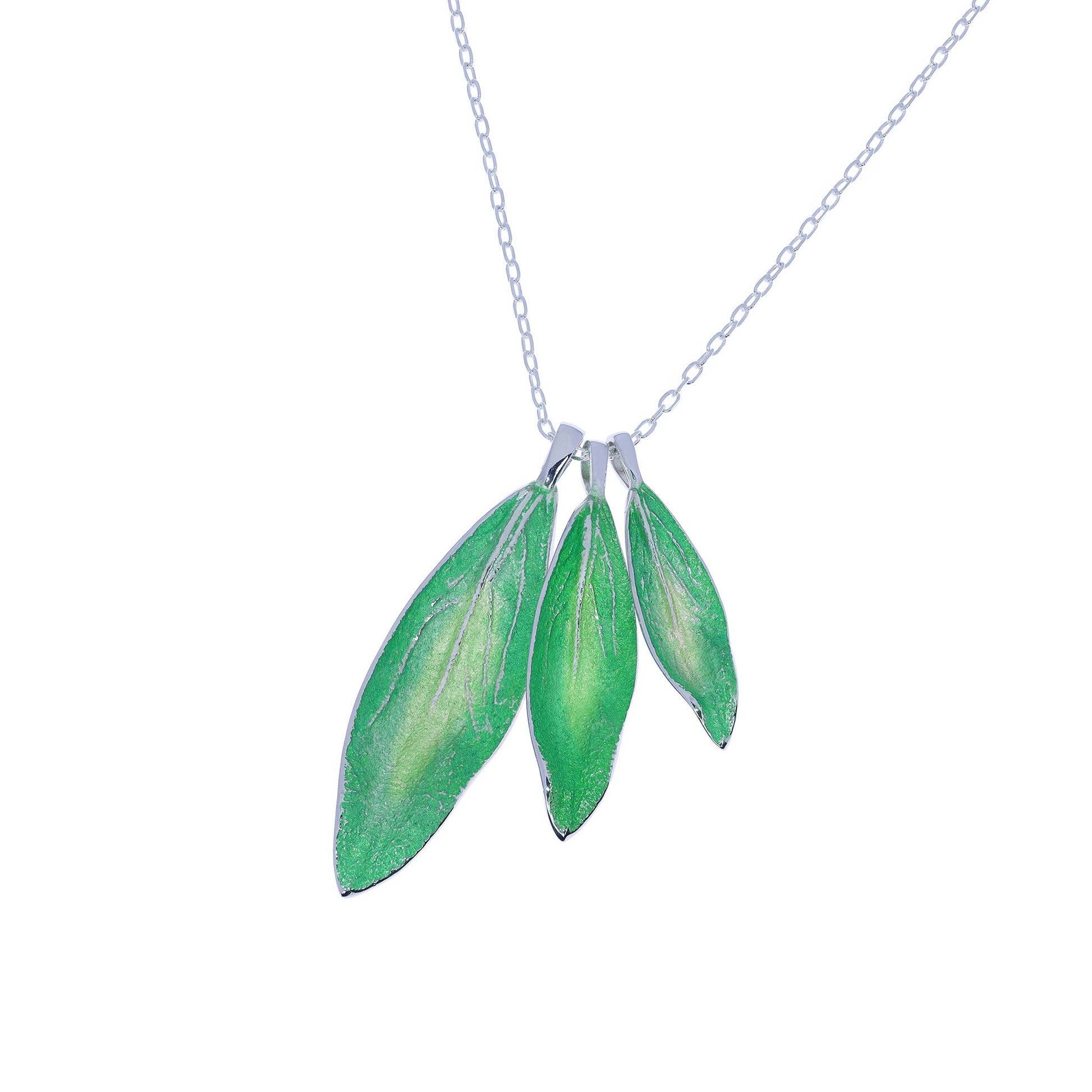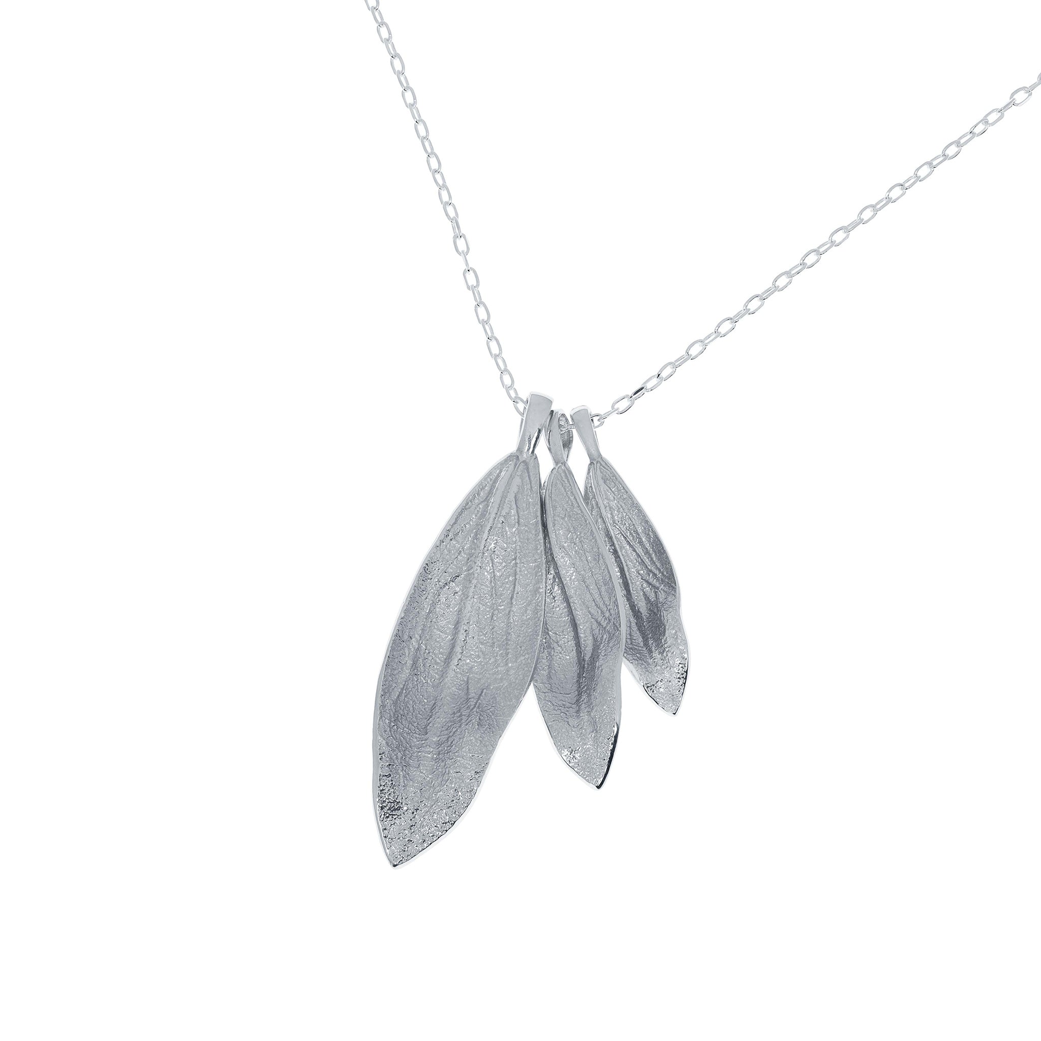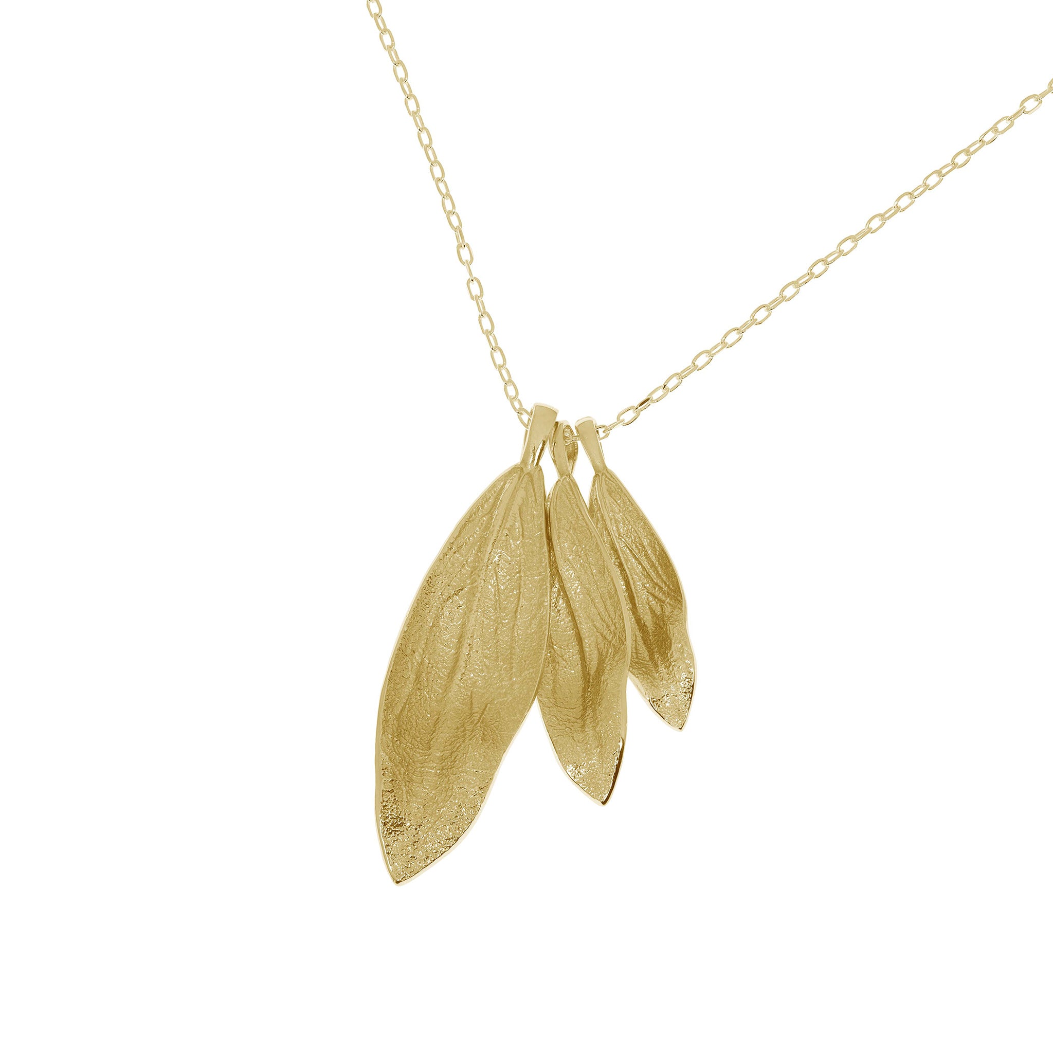 El colgante de tres piezas de la COLECCIÓN ABRIL combina diferentes tamaños de hojas creando una composición dinámica que recuerda al movimiento natural de las ramas y el crecimiento de la vegetación.