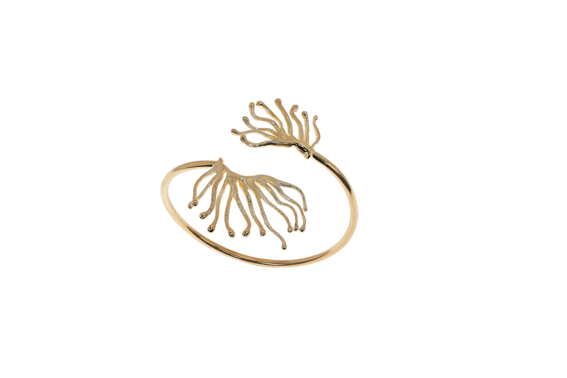 El brazalete de la COLECCIÓN AGAR es una pieza escultórica que celebra las formas orgánicas del mar. Compuesto por dos piezas centrales en forma de alga: una pequeña de 2,5 cm de ancho y 1,8 cm de largo, y una grande de 2 cm de ancho y 3,5 cm de largo, ambas en plata de ley 925 con opción de chapado oro, rodio y pigmento. El aro suma un total de 20 cm en plata 925, creando una joya expresiva que equilibra fuerza y sensibilidad.