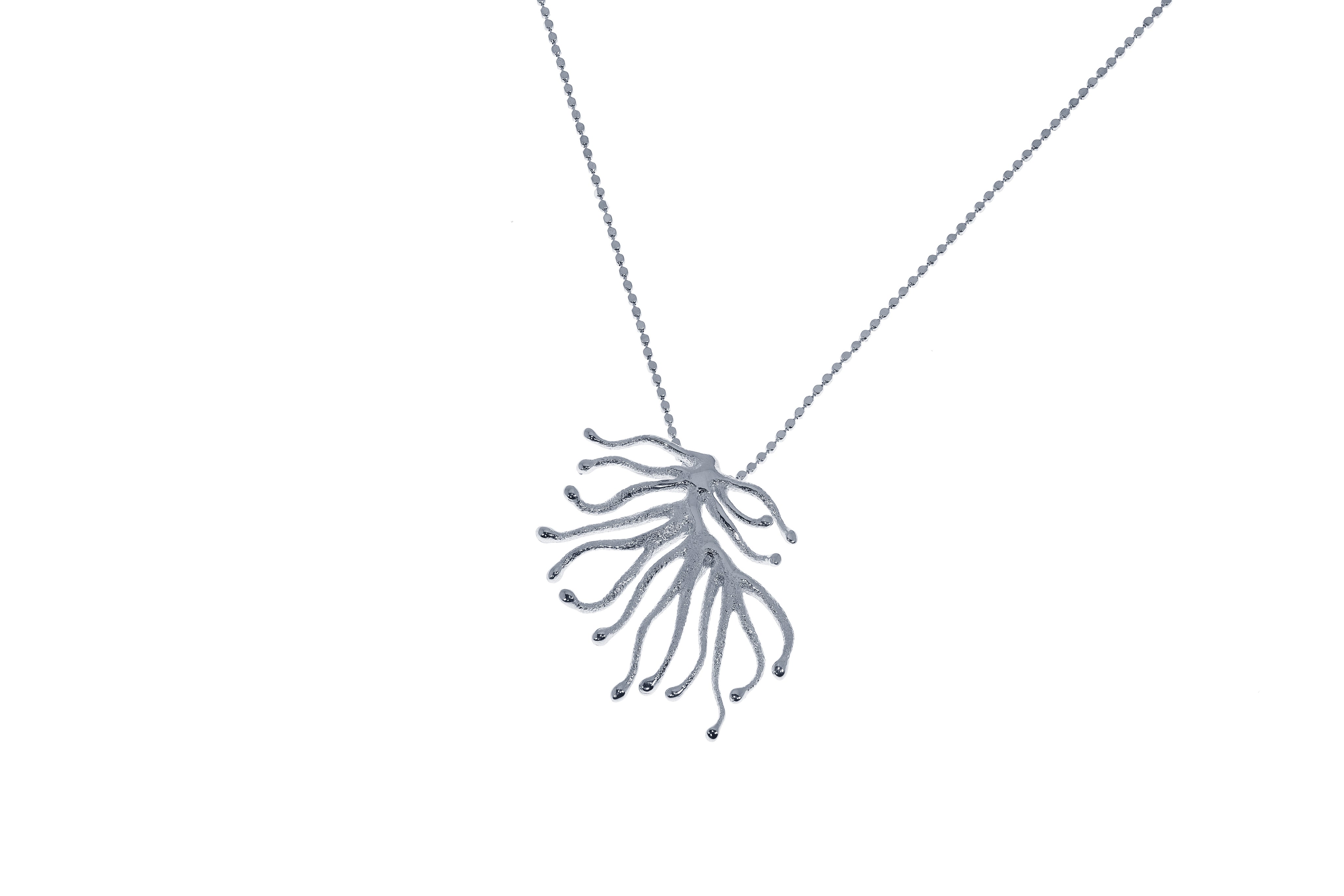 Este colgante grande de la COLECCIÓN AGAR captura la belleza serena de las algas en su danza silenciosa. Su pieza central, con forma orgánica de 3 cm de ancho y 3,5 cm de largo, está elaborada en plata de ley 925 y disponible con chapado en oro, rodio y pigmento, resaltando la textura y el color con carácter artesanal. Se acompaña de un collar de cadena de plata de 50 cm, con terminales y reasa en plata 925, creando una joya expresiva que conecta emoción y naturaleza.