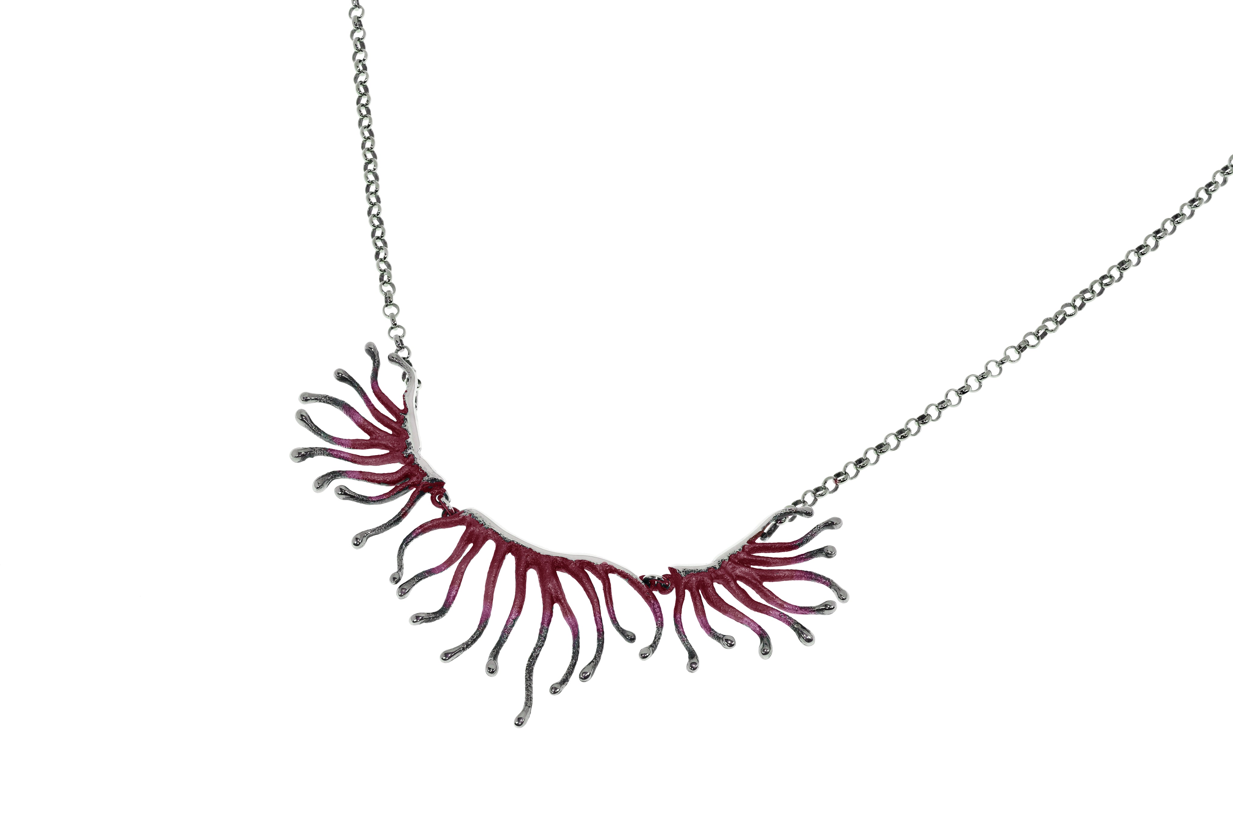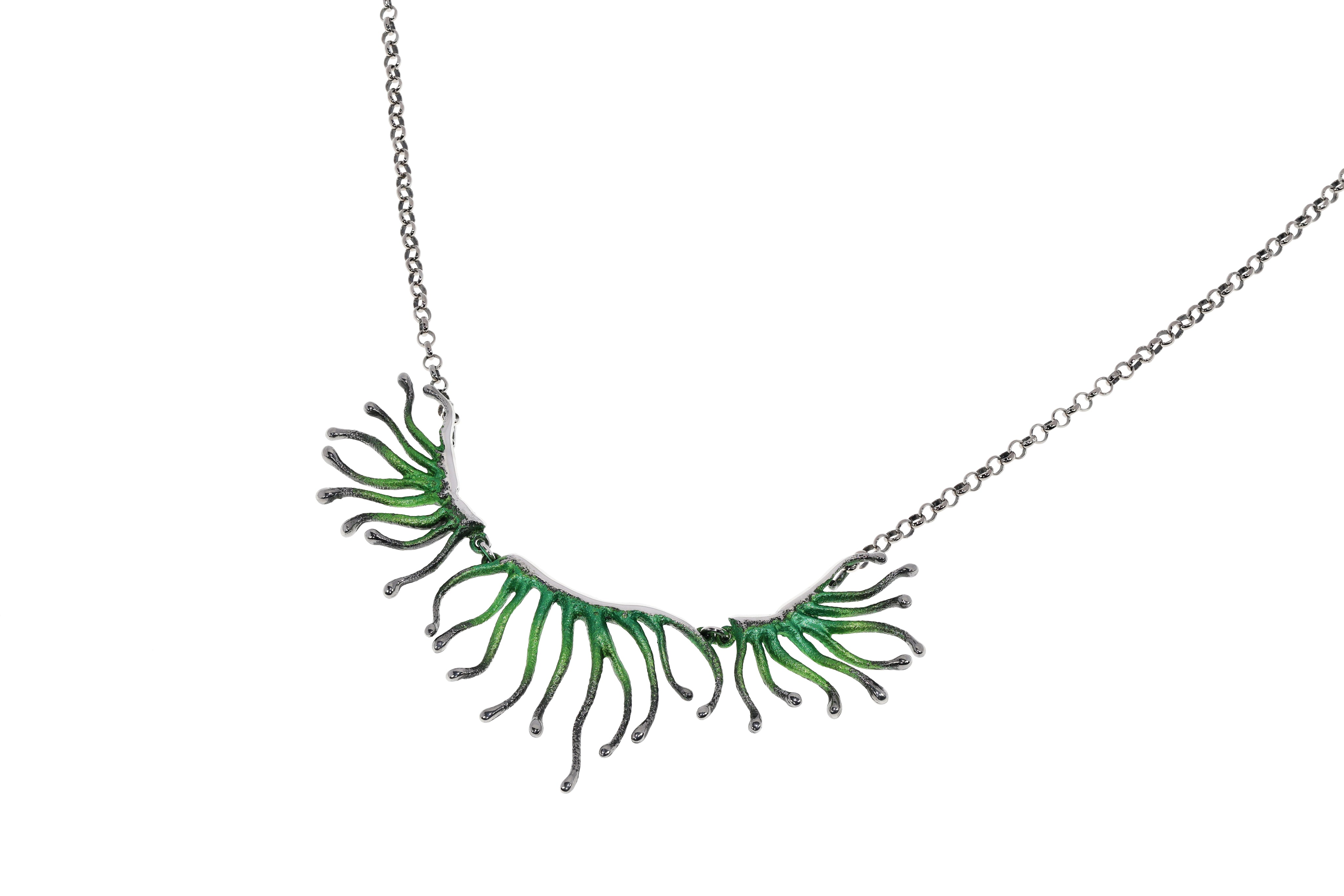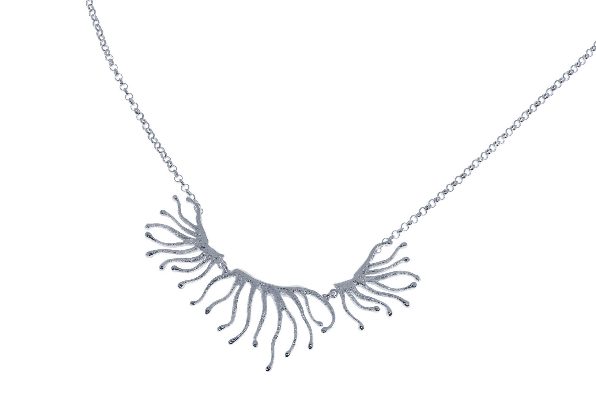 La COLECCIÓN AGAR se expresa con fuerza y delicadeza en esta gargantilla inspirada en la naturaleza submarina. Tres piezas centrales en forma de alga, de 7 cm de ancho y 2,5 cm de largo, evocan el movimiento orgánico del fondo marino y su profundidad emocional. Realizada en plata de ley 925, con opción de chapado en oro, rodio y pigmentación artesanal, esta joya une tradición orfebre e innovación cromática. Se completa con un collar de cadena de plata de 38 cm, con terminales y reasa en plata 925, dando lugar a una pieza de joyería con alma y diseño accesible.