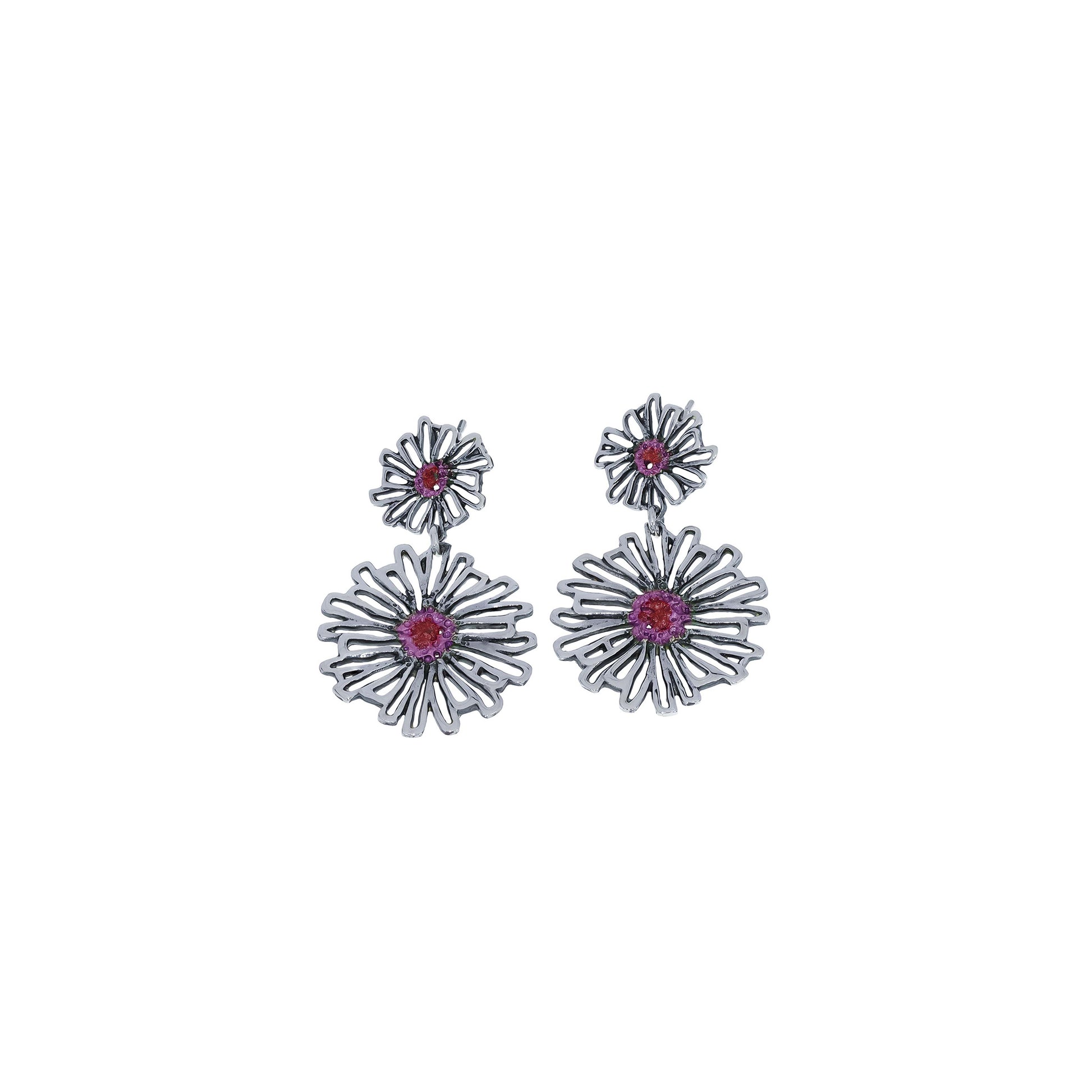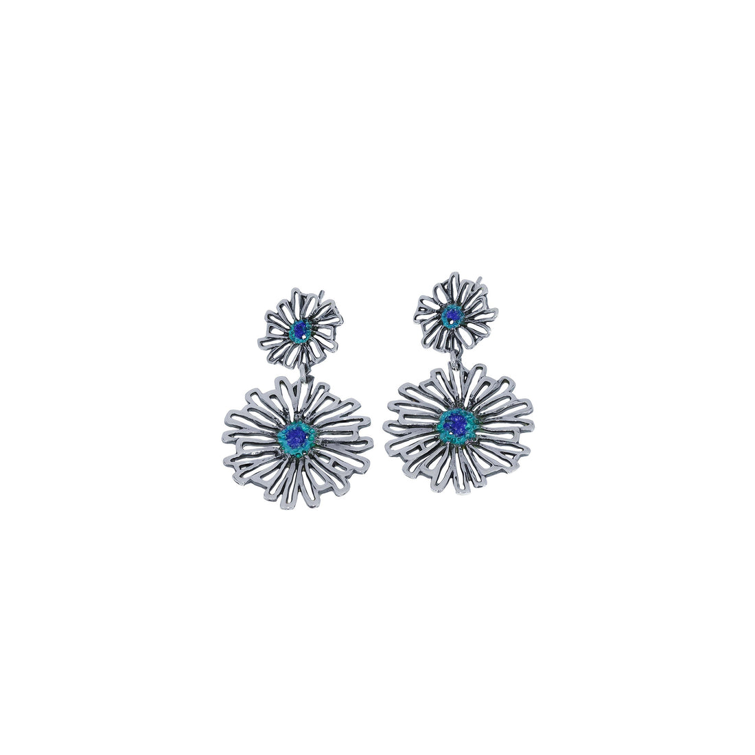 Realizados en plata de ley 925, disponibles en pigmentos naturales metálicos. La pieza superior mide 1,40 cm, la inferior 2,35 cm, con un largo total de 3,85 cm. Incorporan espigo corto y cierre de presión en plata 925.