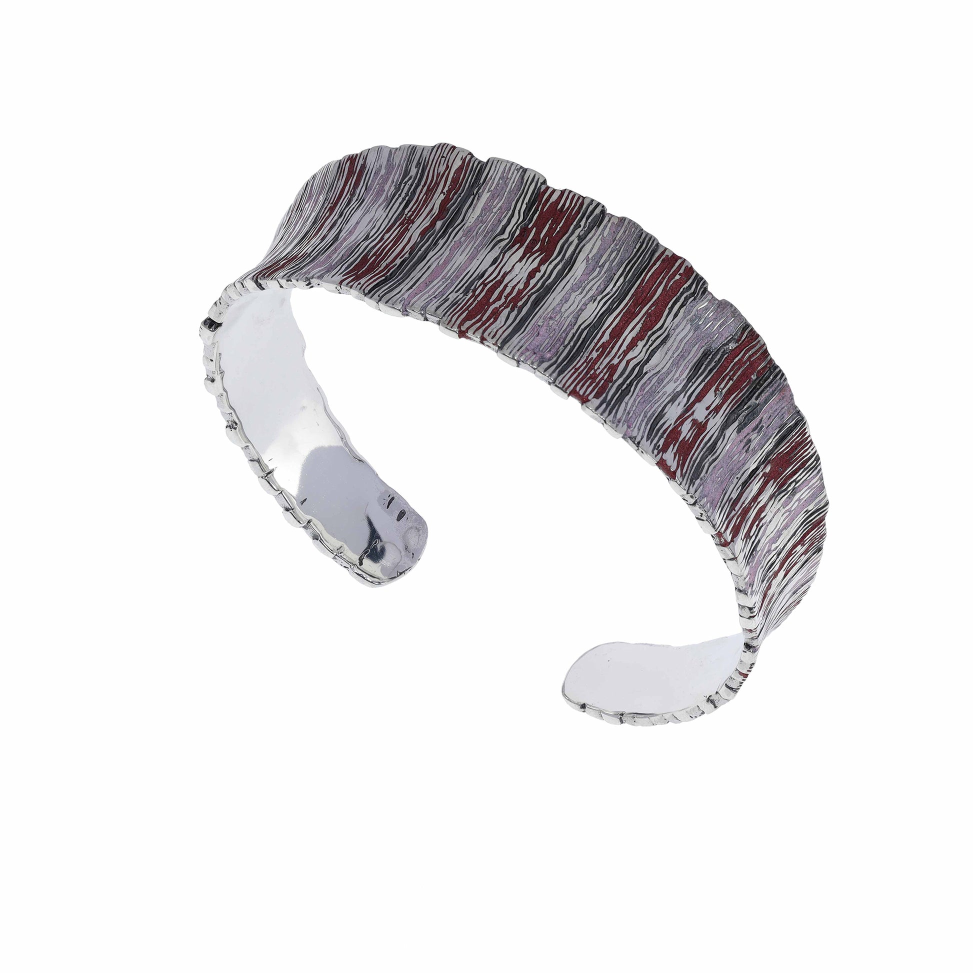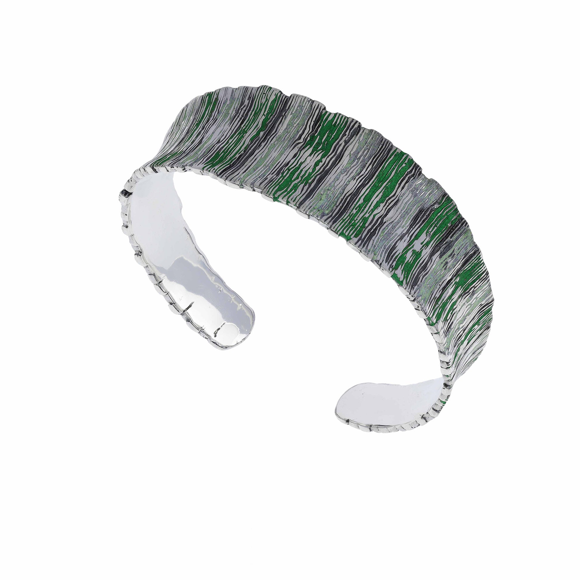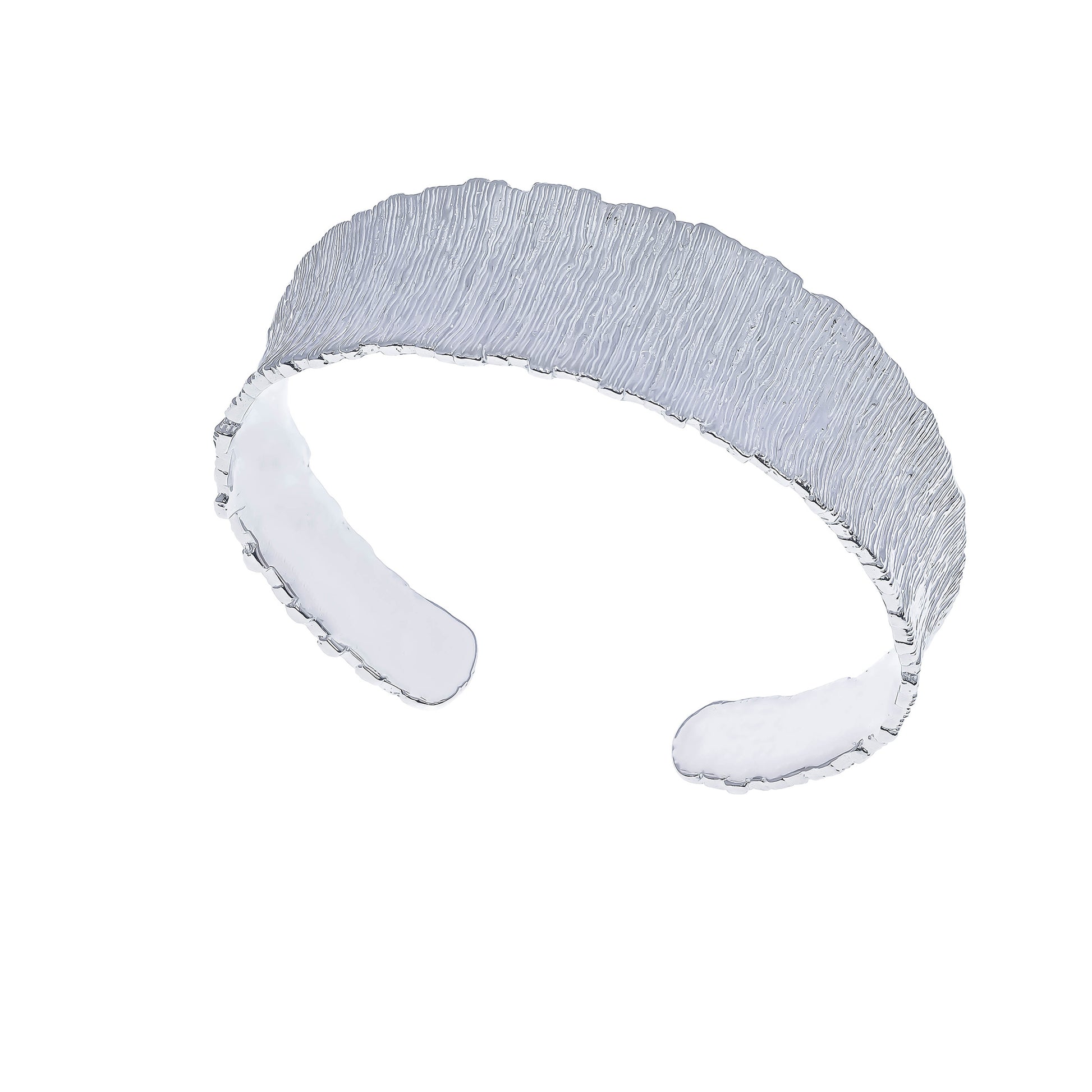 Realizado en plata de ley 925, presenta una pieza superior de 2,40 cm de ancho y un diámetro total de 18 cm, creando un diseño contundente y elegante que envuelve la muñeca con personalidad.