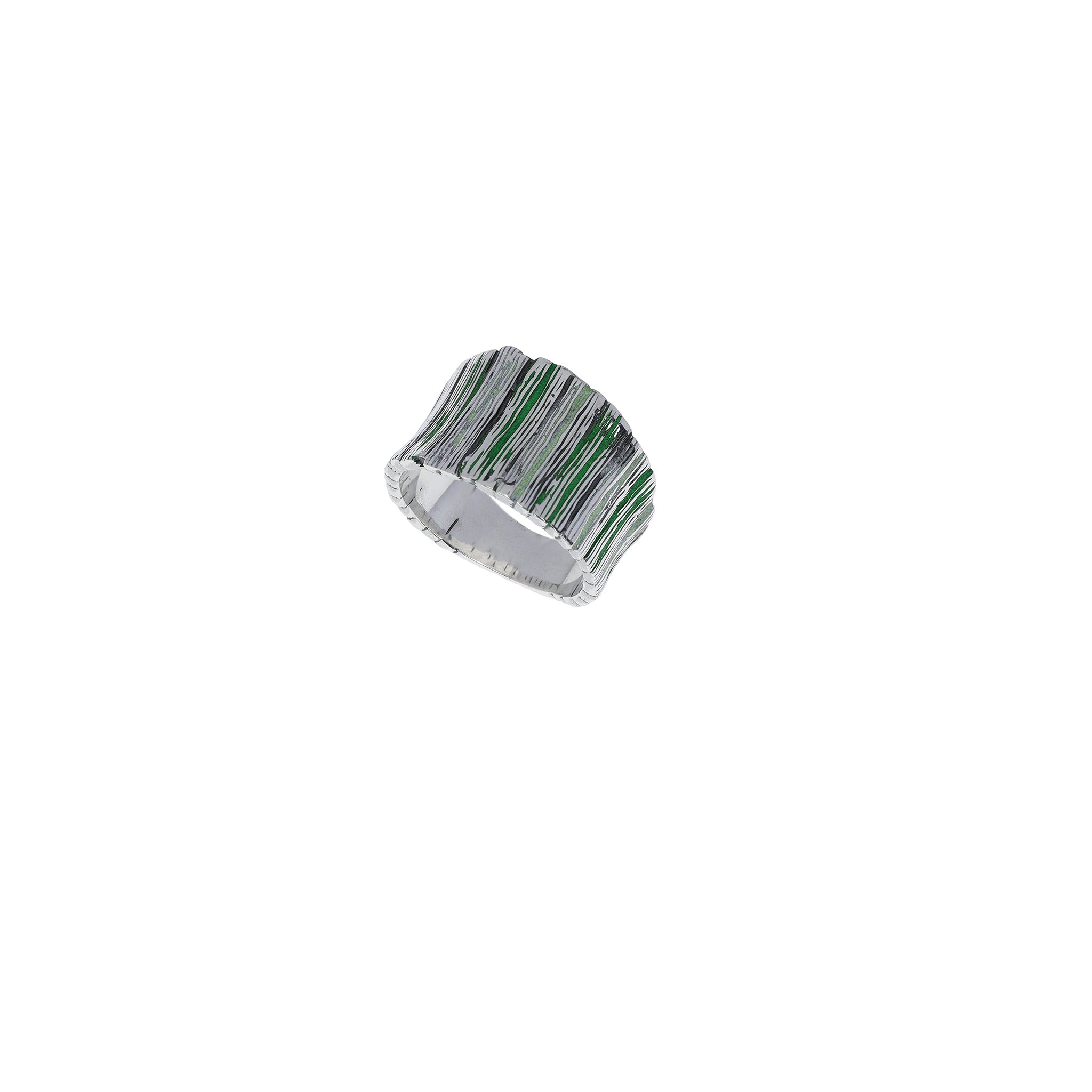 La sortija de formas rectas de la COLECCIÓN HAYA destaca por su diseño sólido y estructurado. La parte superior más ancha crea un volumen que recuerda a los cortes de madera noble, transmitiendo fuerza y estabilidad visual.