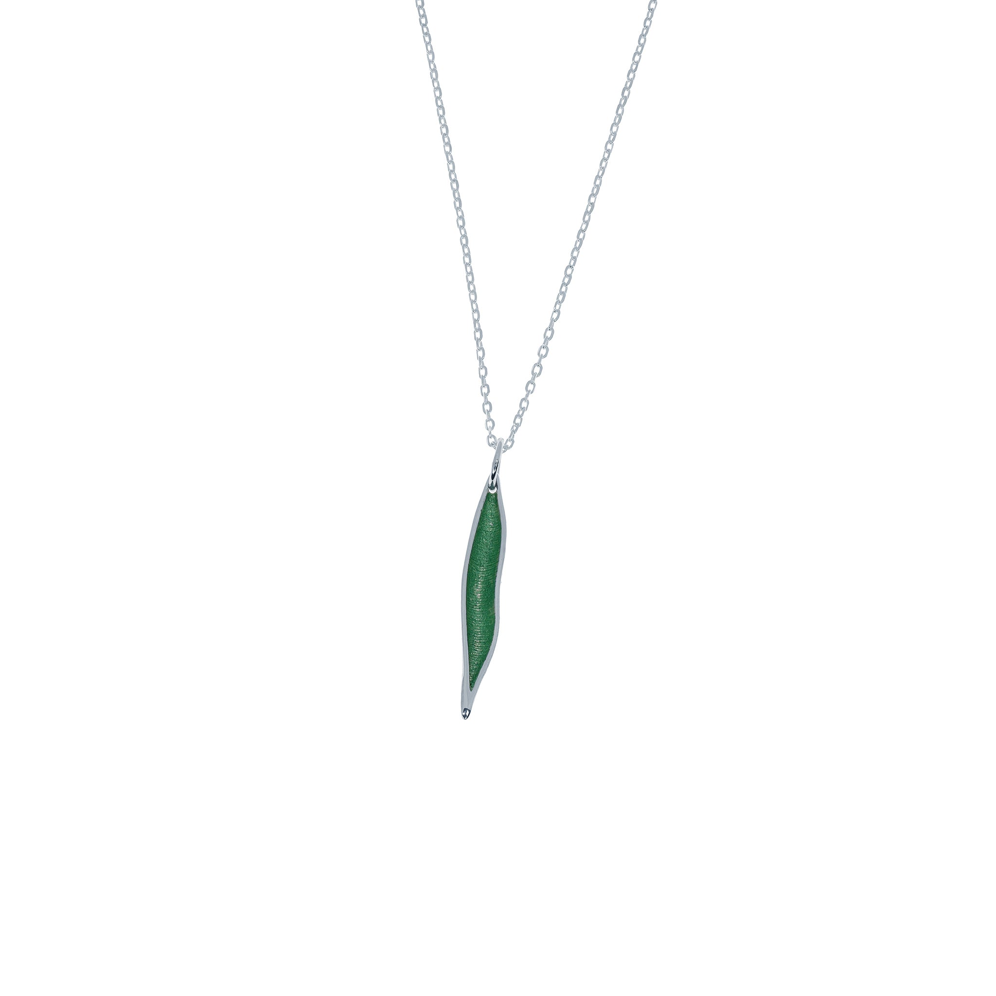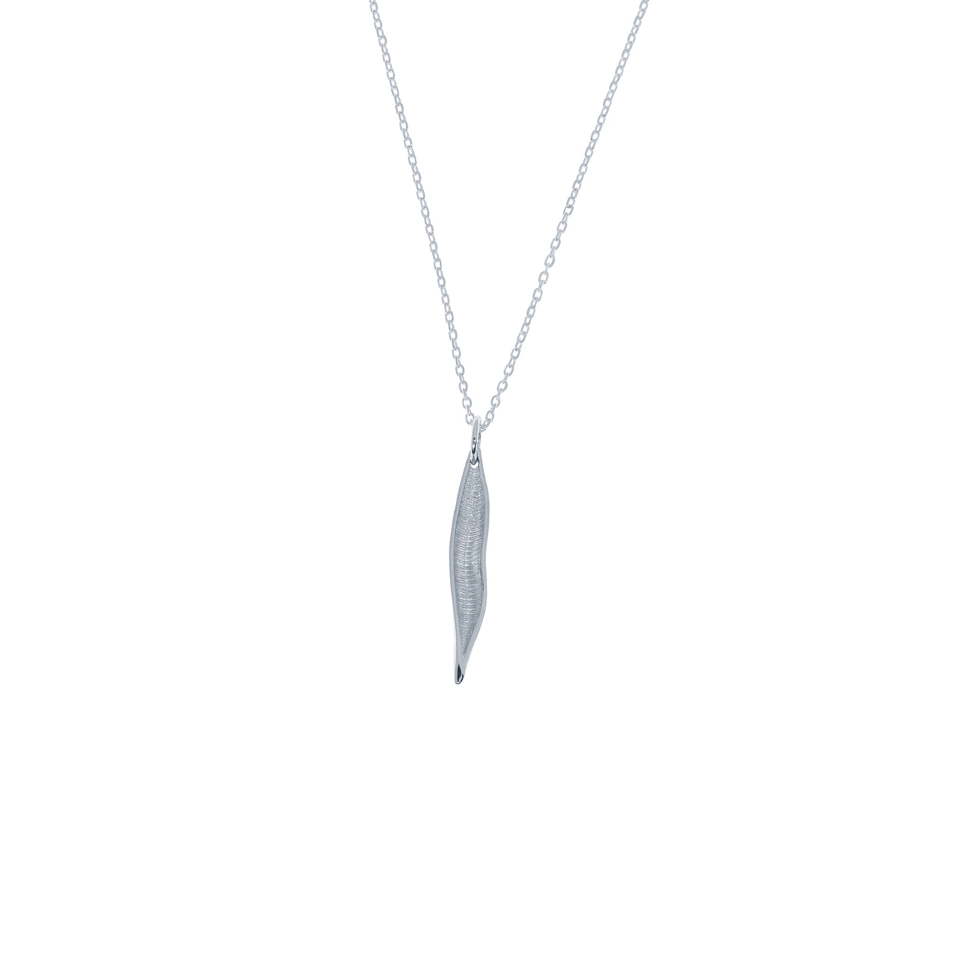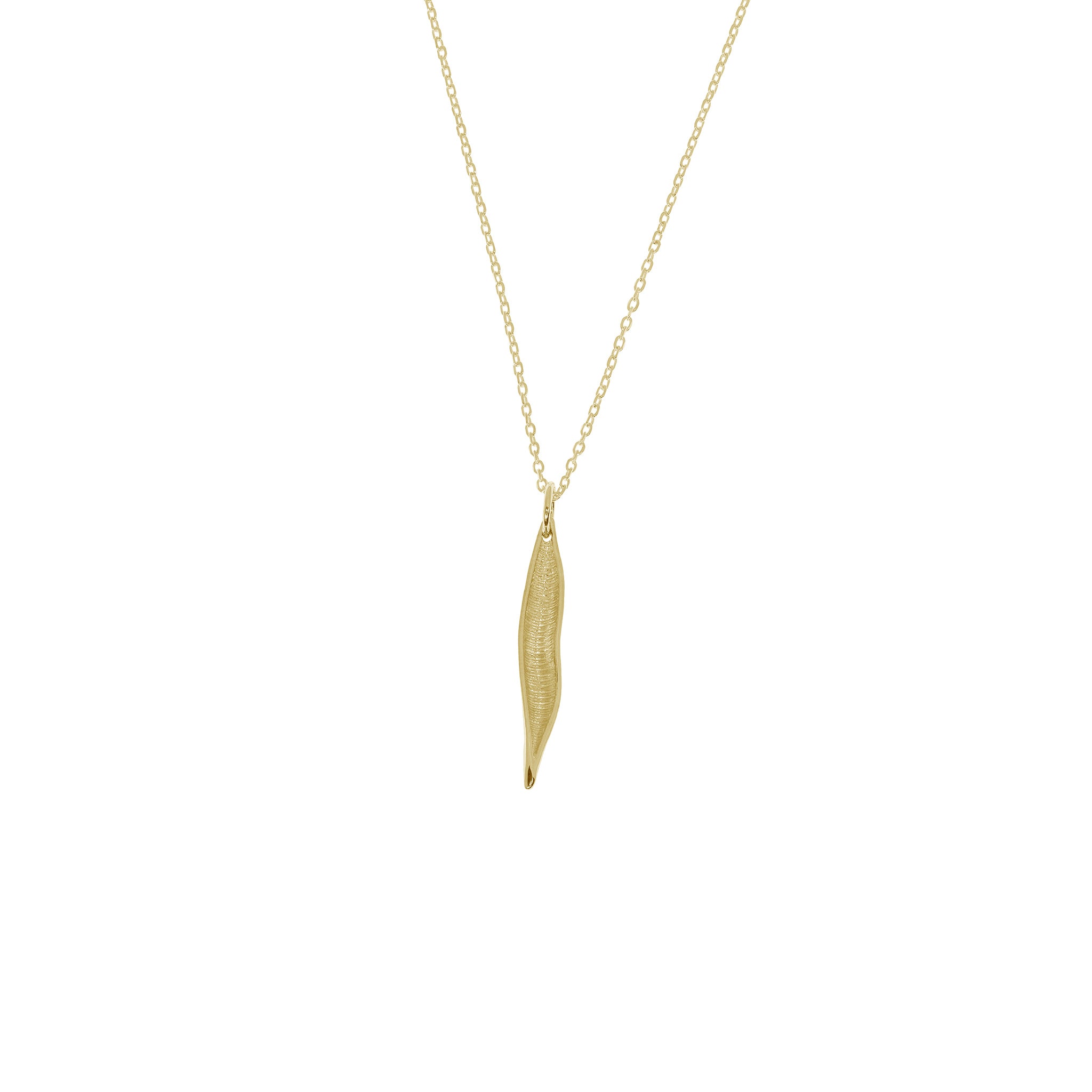 El colgante pequeño de la COLECCIÓN KENIA ofrece una interpretación más delicada del diseño inspirado en la vaina. Su tamaño reducido resalta la pureza de la forma y la ligereza de la pieza, convirtiéndola en una joya discreta y elegante.