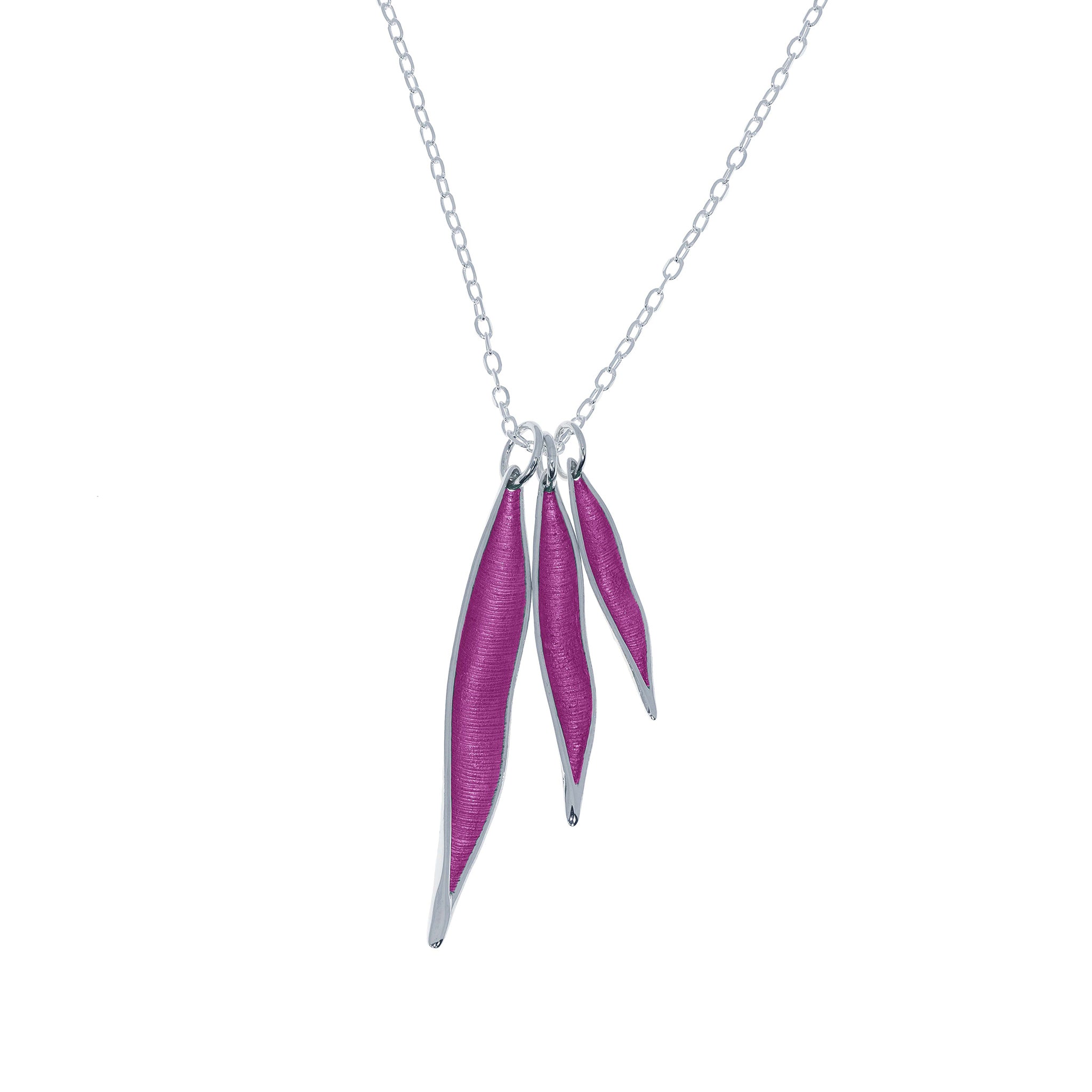El colgante de tres piezas de la COLECCIÓN KENIA combina diferentes tamaños de la forma de vaina para crear una composición dinámica y equilibrada. Las tres piezas generan un juego de proporciones que aporta movimiento y riqueza visual al diseño.