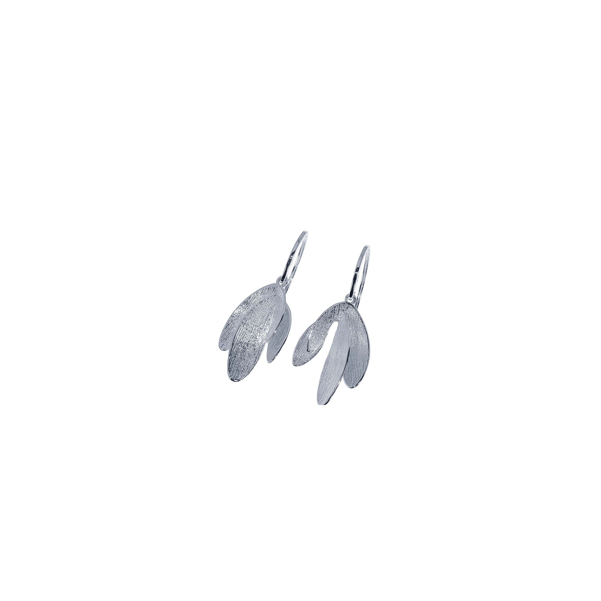 Confeccionados en plata de ley 925 con chapado en oro o rodio y pigmento, la pieza floral mide 1,8 cm x 2,5 cm y se combina con un gancho vertical móvil de 1,30 cm en plata 925.