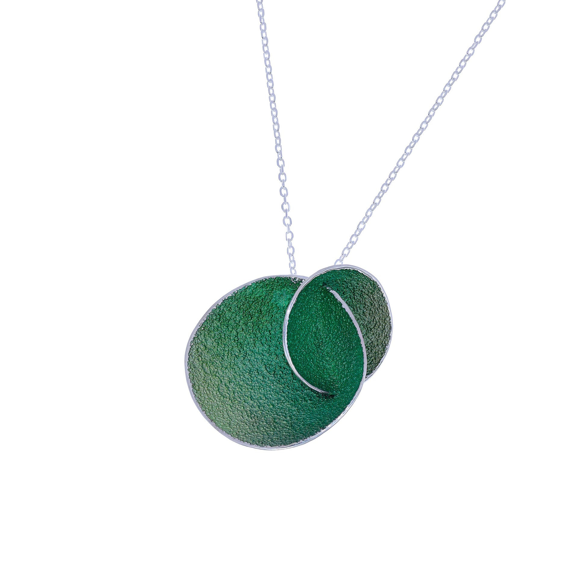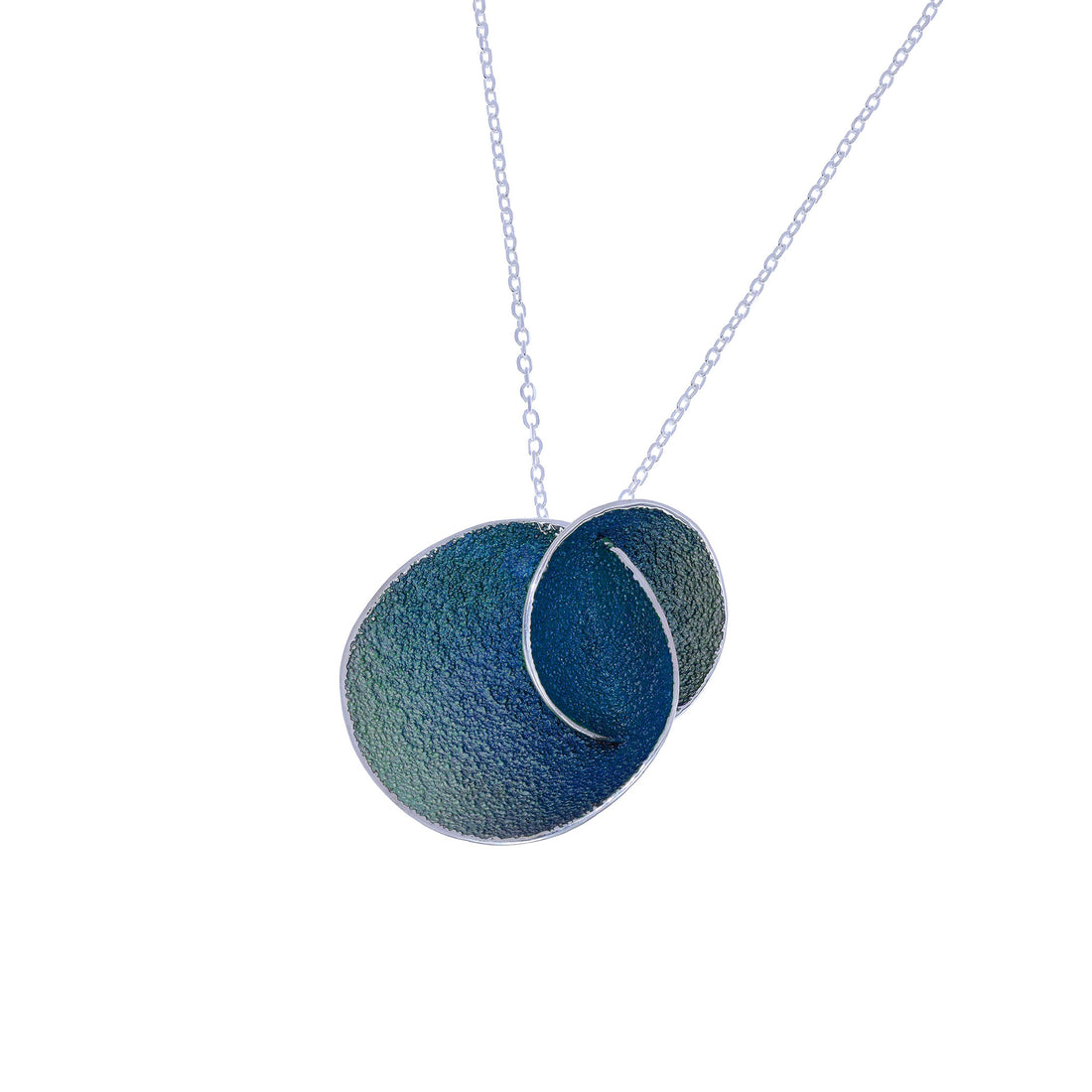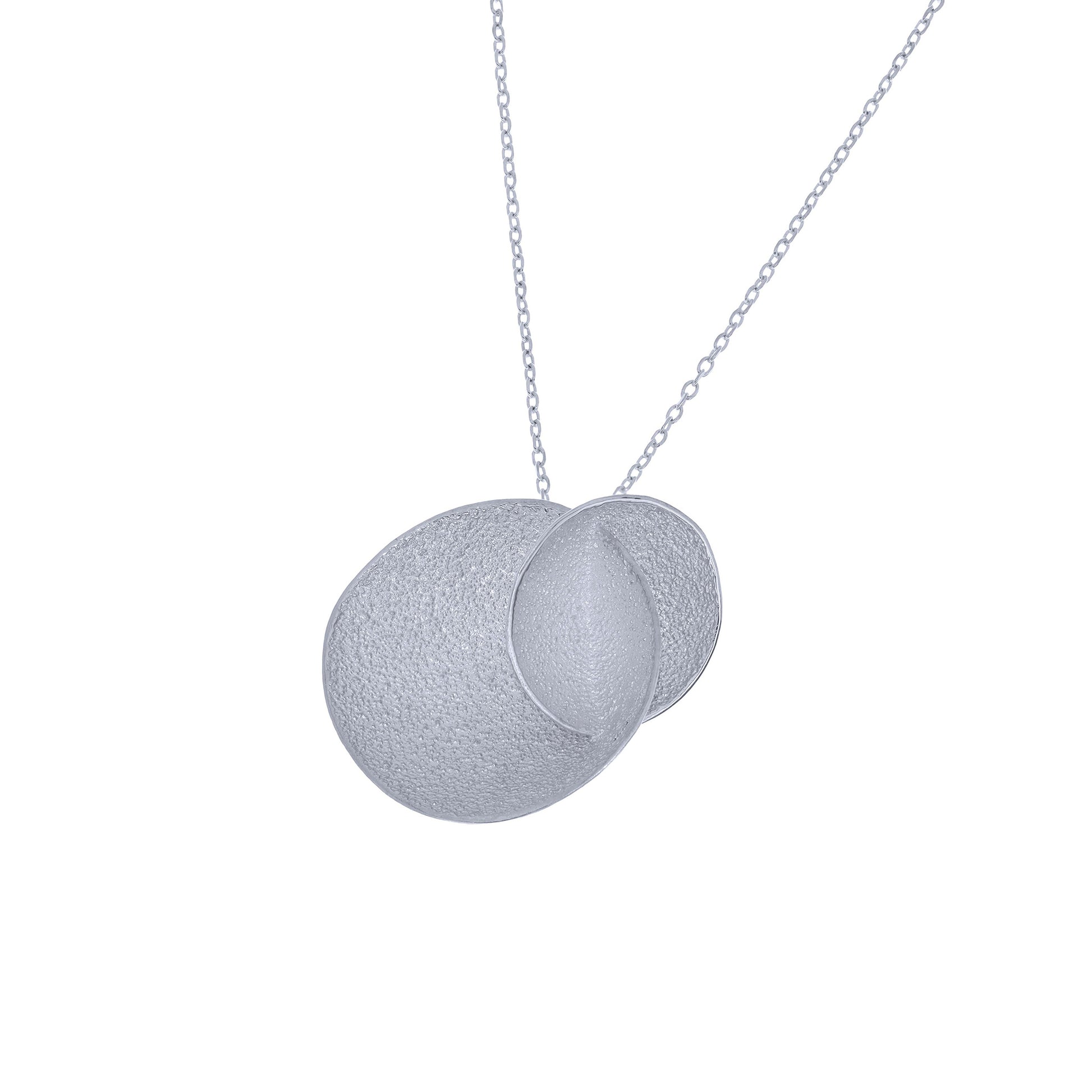 Realizado en plata de ley 925, el colgante incorpora dos cuencos de 3,5 cm x 3 cm, suspendidos de una cadena de plata de 50 cm con terminales y reasa en plata 925.
