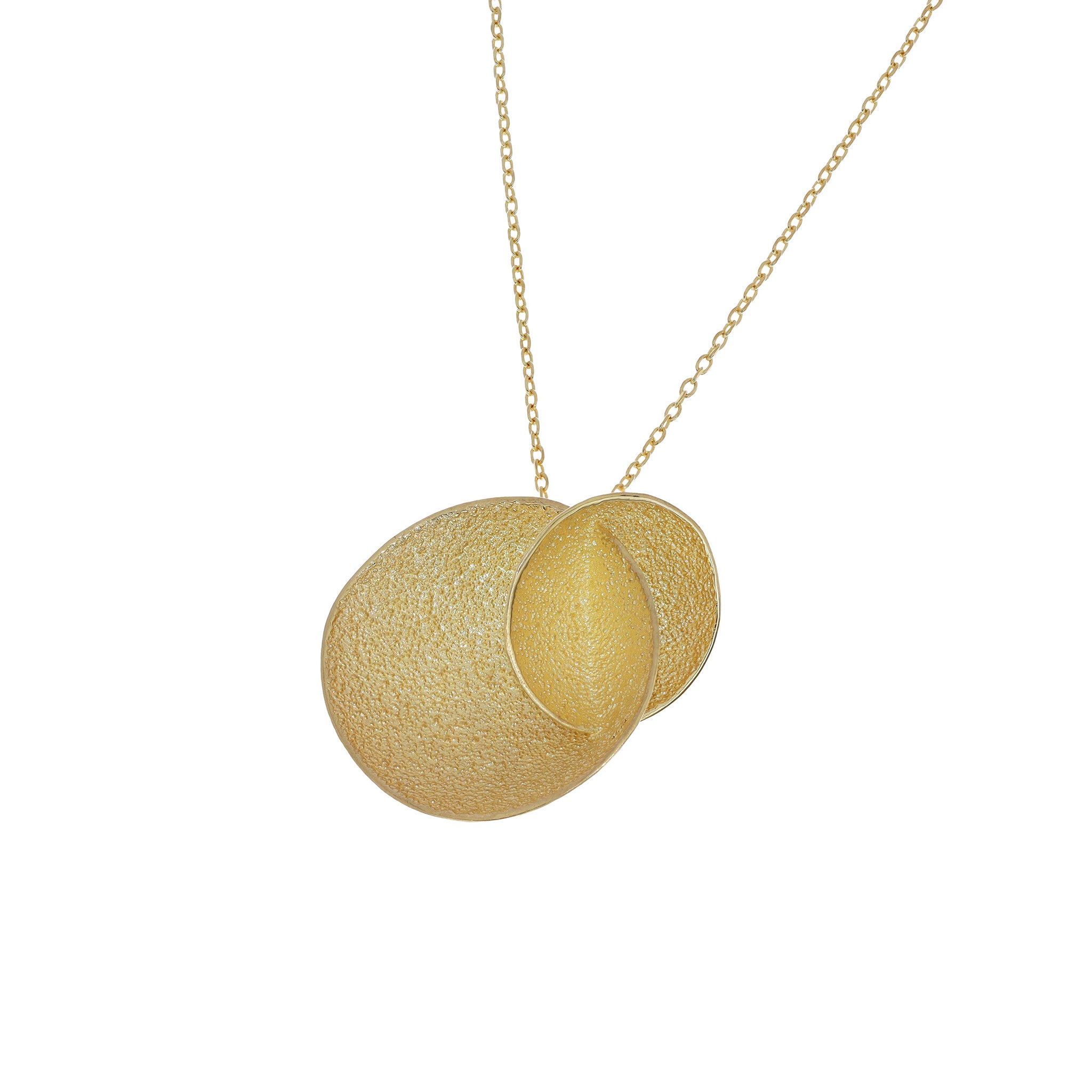El colgante grande de la COLECCIÓN MOLLY destaca por su presencia y su carácter escultórico. Está compuesto por dos piezas que evocan pequeños cuencos cerámicos unidos, generando una forma orgánica de gran personalidad. Sus volúmenes suaves y su textura transmiten la esencia artesanal que inspira toda la colección, creando una joya original que se convierte en el centro de cualquier look.