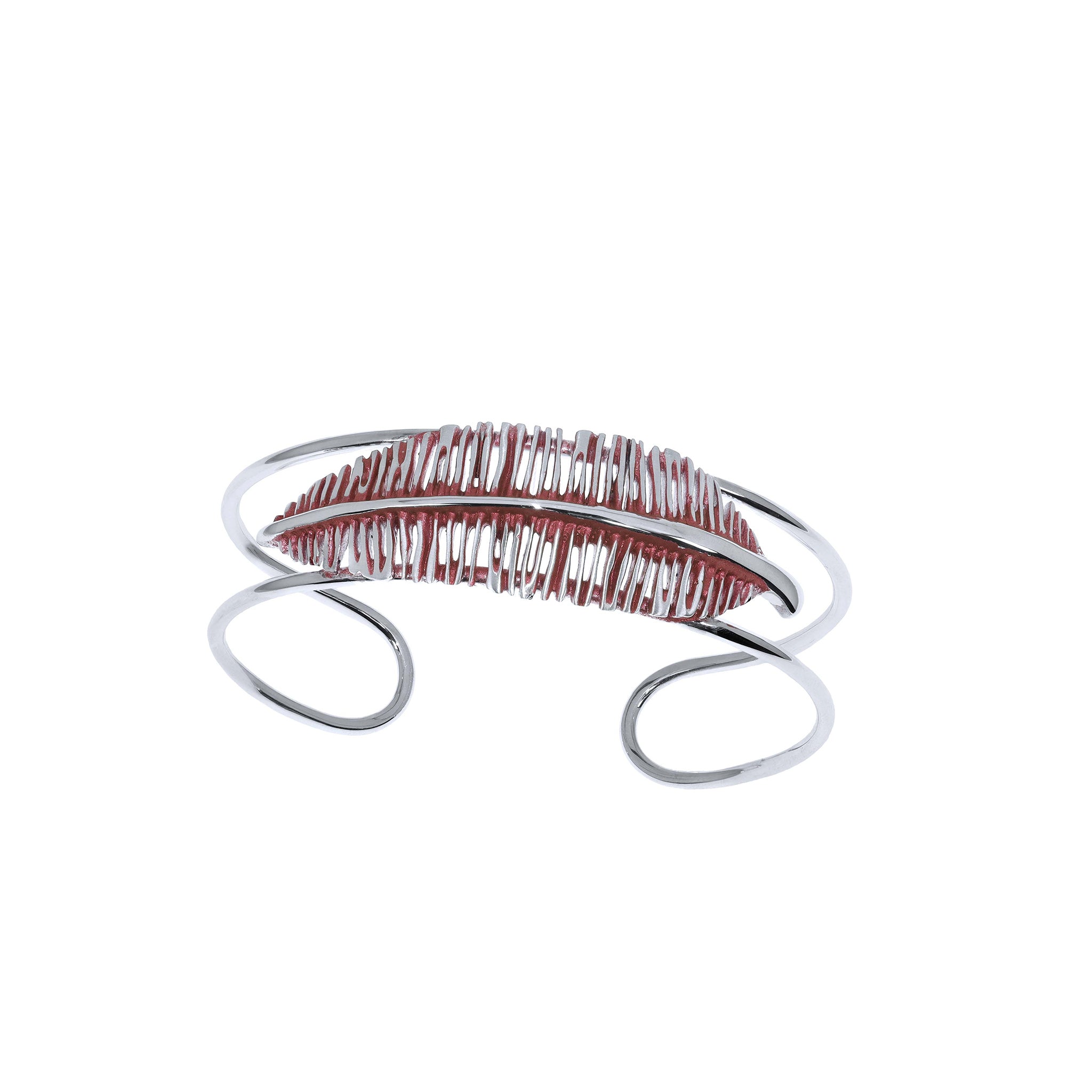 Con un carácter más rotundo, el brazalete grande de la COLECCIÓN YUCCA es una declaración de fuerza y estilo. Su hoja central de 6 cm x 2 cm, realizada en plata de ley 925 con chapado en oro, rodio y pigmento, se acompaña de doble aro en plata 925, aportando presencia y una elegancia decidida.