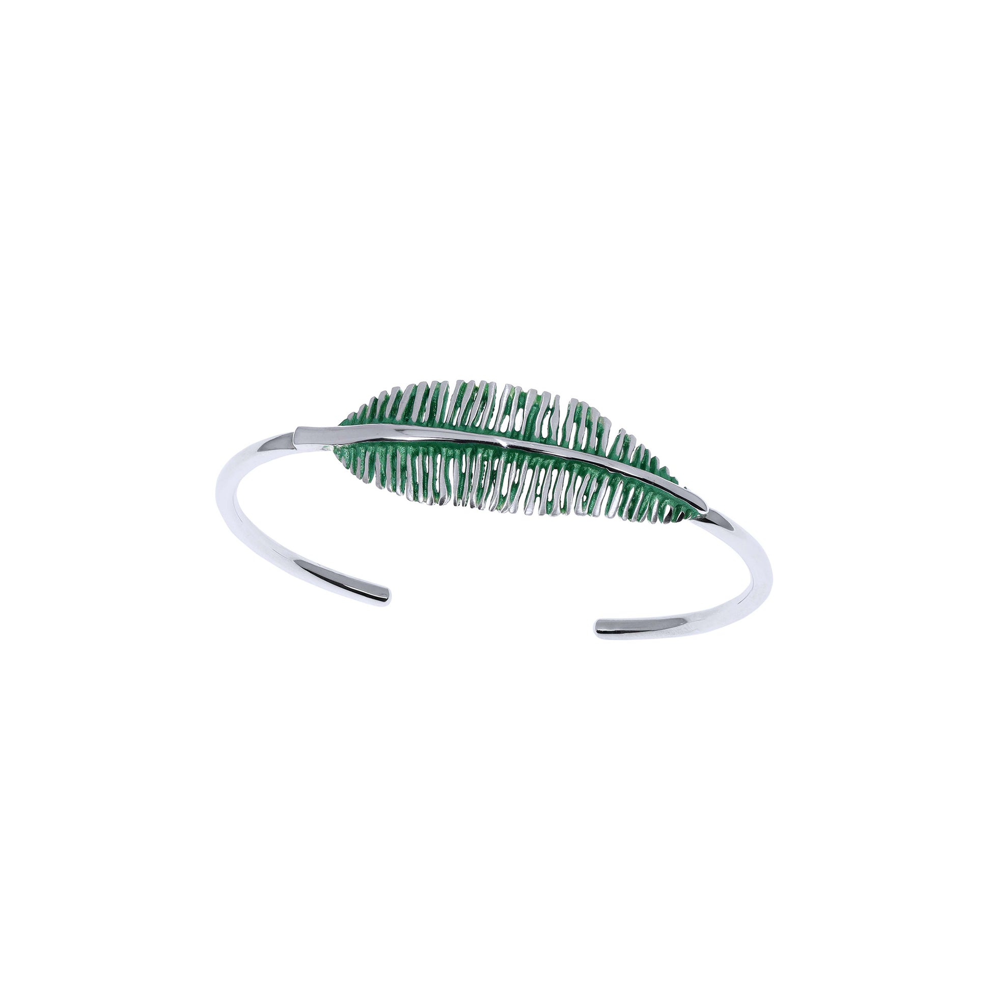 El brazalete pequeño de la COLECCIÓN YUCCA destaca por su diseño contemporáneo y su inspiración vegetal. La pieza central en forma de hoja de 4,5 cm x 1,5 cm se integra en un aro de plata 925, creando una joya firme y equilibrada, disponible en acabados oro, rodio y pigmento Simeltech®.